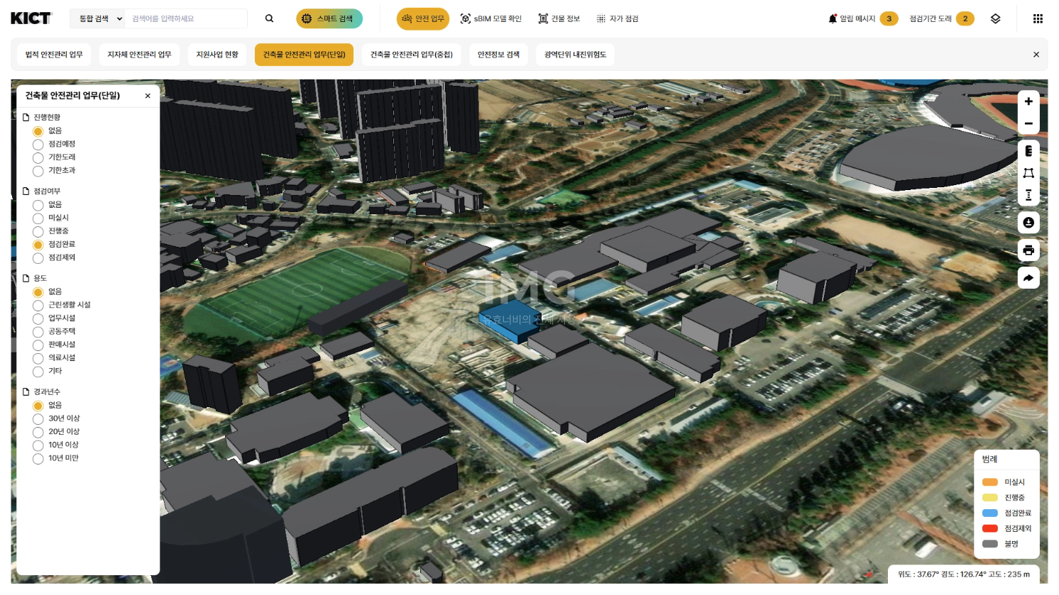 BIM(건축 정보 모델) 데이터를 연동하여 건물의 점검 결과와 이력을 3D 모델 형태로 시각화함으로서 상세한 상태 분석과 효율적인 유지보수 계획 수립 가능