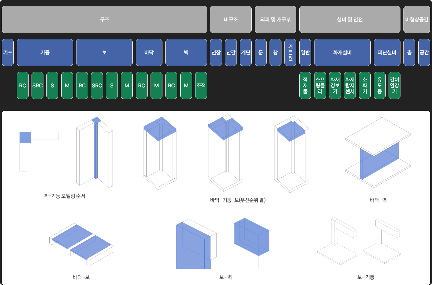 · 건물의 구조․화재 안전관리에 필요한 안전정보만 수록한 저용량의 경량 3D BIM · 형상정보만 모델링 되고, 기타 정보는 디지털화된 속성정보(text)로 제공하는 BIL20~30 수준의 모델